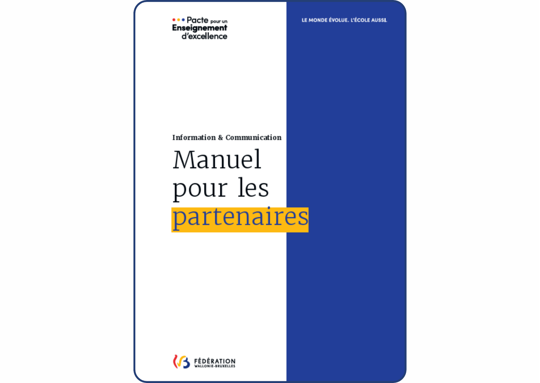 Le Manuel pour les partenaires est un document évolutif. Il est destiné à toutes celles et ceux qui doivent, à un moment ou un autre, communiquer sur le Pacte pour un Enseignement d’excellence. Après une première publication en juillet 2022, l'édition 2025 complètera le panorama des mesures du Pacte avec celles entrées en vigueur en 2023, 2024 et 2025.